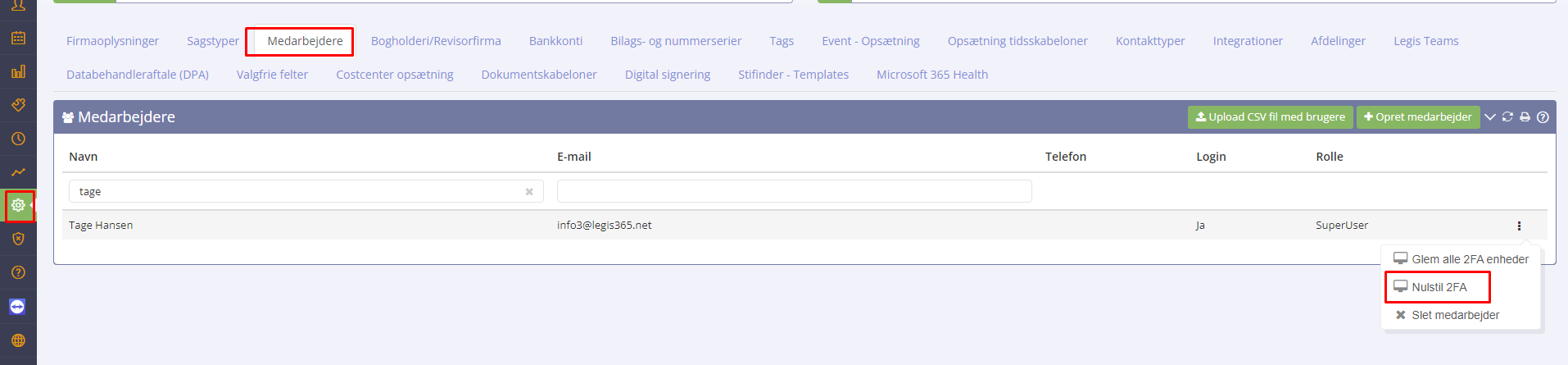 Dette gøres under Opsætning > medarbejder, hvor man klikker på de 3 prikker og vælger 'Nulstil 2FA'