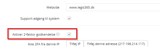 - Aktiver 2FA i Legis ved at gå til Opsætning > Firmaoplysninger, sæt flueben i 'Aktiver 2-faktor godkendelse'.